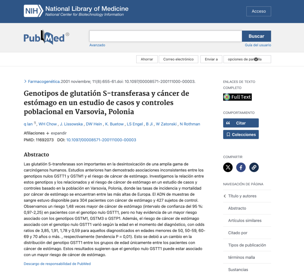 - Glutatión S-transferasas M1, genotipos T1 y el riesgo de cáncer gástrico: un estudio de casos y controles.Cai L, Yu SZ, Zhang ZF.Mundo J Gastroenterol. 2001 agosto; 7 (4): 506-9. doi: 10.3748/wjg.v7.i4.506.PMID: 11819818 Artículo gratuito de PMC.