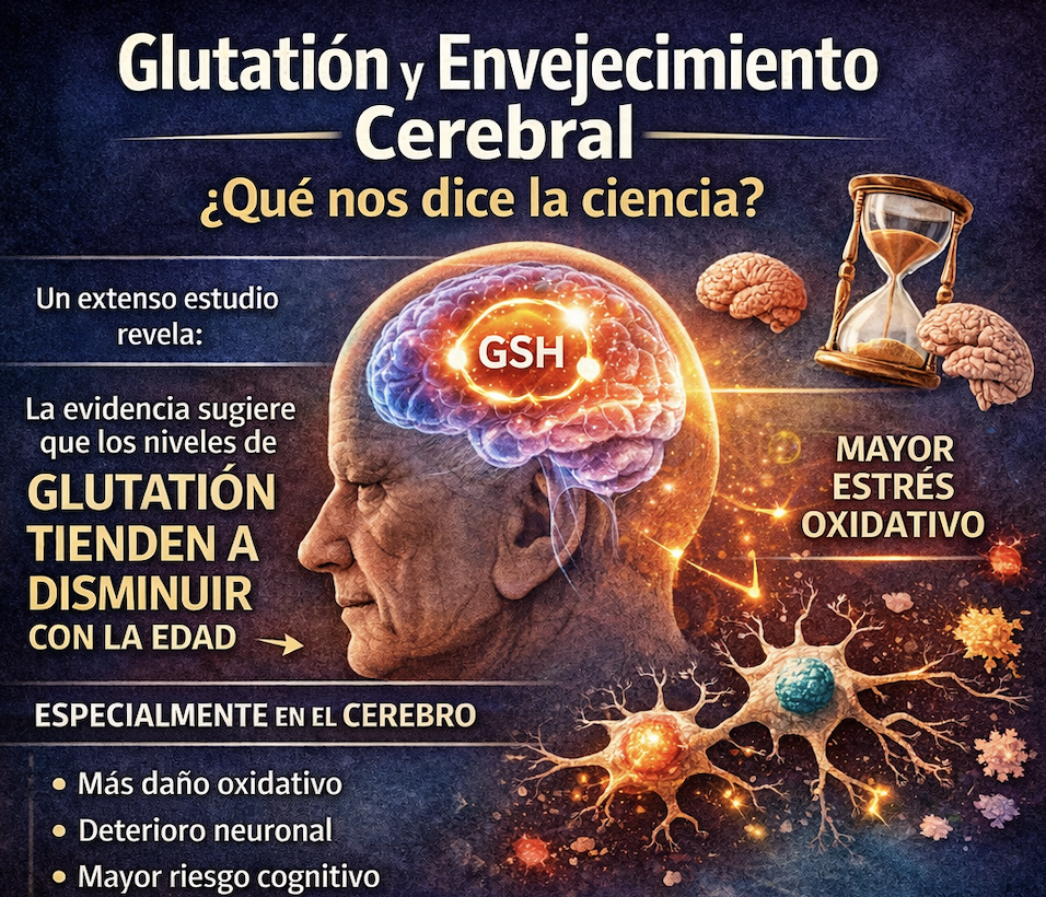 Un reciente y extenso estudio de revisión científica publicado en NeuroImage: Clinical (2023) confirma una tendencia preocupante: los niveles de glutatión tienden a disminuir con la edad, especialmente en el cerebro, uno de los órganos más sensibles al daño oxidativo.