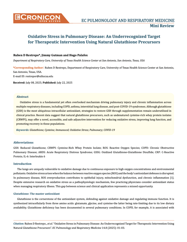 El estrés oxidativo es un mecanismo fundamental pero frecuentemente subestimado que impulsa la lesión pulmonar y la inflamación crónica en múltiples enfermedades respiratorias. A pesar de que el glutatión (GSH) es el antioxidante intracelular más ubicuo, las estrategias para restaurarlo mediante suplementación permanecen subutilizadas en la práctica clínica.