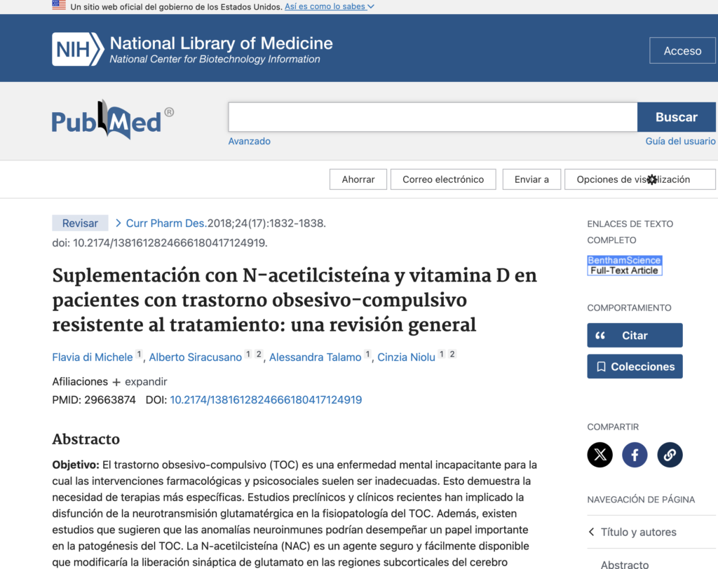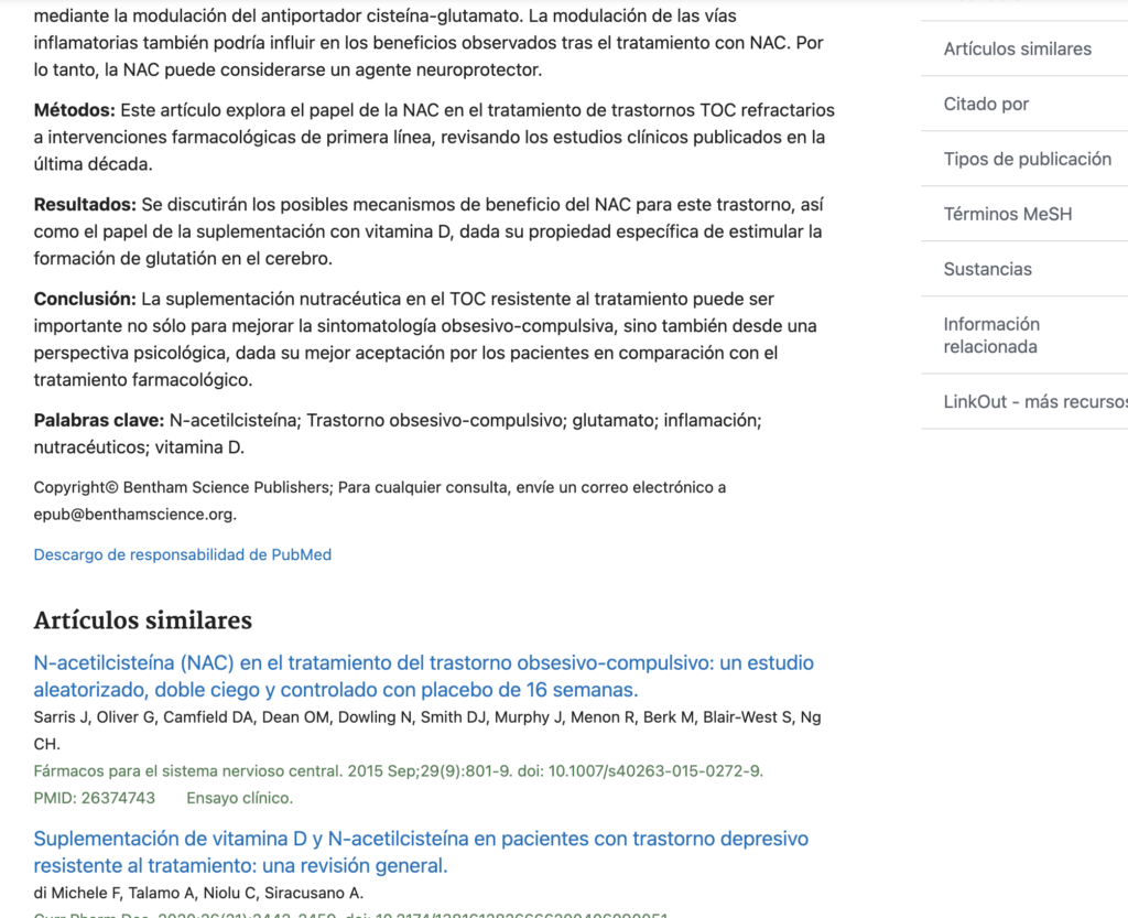 - Intervenciones con Precursores del Glutatión: Se ha investigado el uso de precursores como la N-acetilcisteína (NAC), que ayuda a aumentar los niveles de glutatión. Ensayos clínicos preliminares han mostrado que la suplementación con NAC puede mejorar los síntomas en pacientes con TOC, probablemente mediante la reducción del estrés oxidativo y la inflamación.