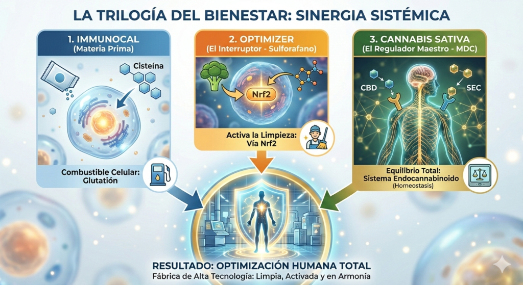 En el mundo de la suplementación de alto nivel, siempre buscamos la máxima eficiencia. Durante años, Immunotec ha liderado el mercado con el precursor del Glutatión (Immunocal) y el activador genético Nrf2 (Optimizer). Hoy, con la integración de los productos de Cannabis Sativa de MyDailyChoice (MDC), se cierra un círculo científico que hasta ahora estaba incompleto.