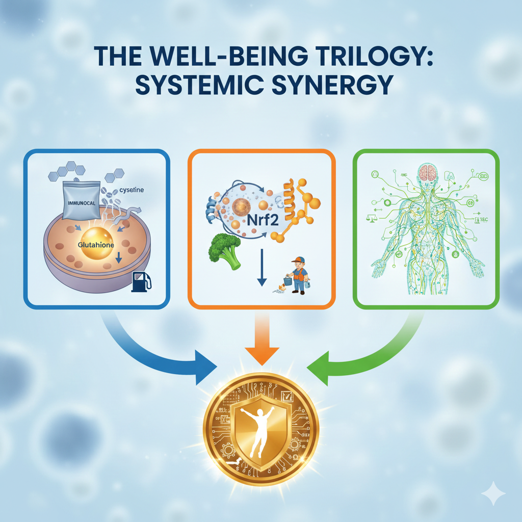 The Optimizer, with its exclusive sulforaphane formula, activates the Nrf2 pathway. This pathway is a genetic message that tells the cell: “Start cleaning up and use that Glutathione!” It is the maintenance crew that puts the house in order.